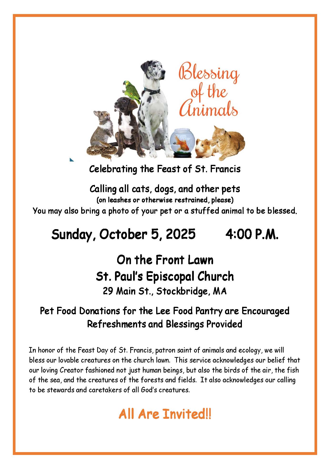 On the Sunday closest to St. Francis Day, we celebrated a Blessing of the Animals, the first for St. Paul’s in several years. Twelve people and seven dogs enjoyed a breezy cool mid-afternoon getting to know each other on the lawn. Advertising in the community was successful, as half the people and most of the animals came from outside the parish. After a short liturgy and stories about St. Francis’ love for all creatures, each animal was individually blessed. Treats and certificates were offered. We even collected a bit of pet food for Lee Food Pantry. There was general agreement among planners and participants that this is an event to be repeated annually.